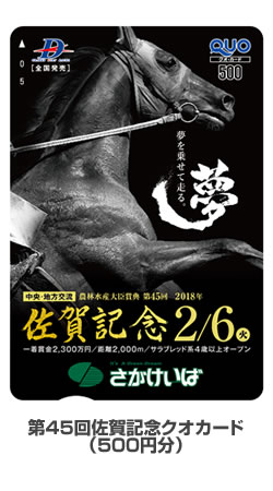 2月は、佐賀競馬から2月6日(火)実施「農林水産大臣賞典 第45回佐賀記念JpnIII」を記念して作成したクオカード(500円分)を5名さまにプレゼントいたします。