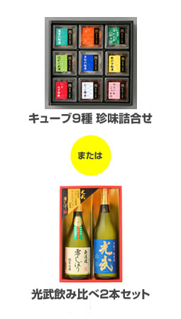 オッズパークでは「キューブ9種 珍味詰合せ」と「光武飲み比べ2本セット」。