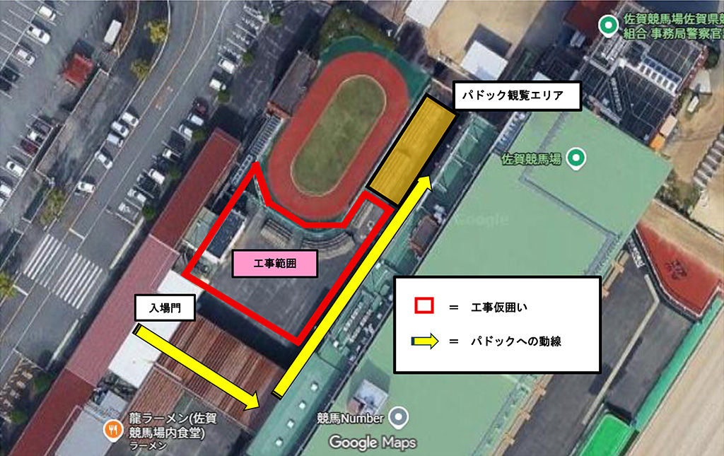 パドック拡張工事に伴うパドック観覧エリアについて 2025.11.23 令和7年11月30日(日)佐賀競馬第15回競馬4日目よりパドック拡張工事のため、パドック観覧エリアの一部を閉鎖いたします。 それに伴い、パドックの観覧可能エリアが特定箇所のみとなります。 お客様にはご迷惑をおかけしますが、何卒ご理解のほどよろしくお願いいたします。