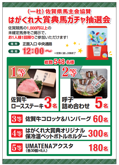 佐賀競馬オリジナルグッズ等が当たる馬ガチャが登場します。