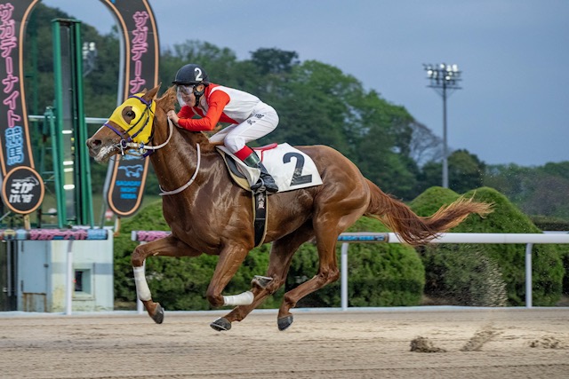 和8年4月1日付で騎手となりました後藤武蔵騎手が、本日第6競走「C2-15組」で、ニシノイッキサス(単勝5番人気/真島元徳きゅう舎)に騎乗。内から徐々に上がっていき、最後の直線で他馬をまとめて一気に差し先頭に立つと、後続を振り切り、2着に2馬身差を付けて第1着となり、デビュー25戦目で初勝利を挙げました。